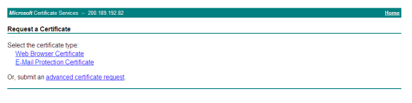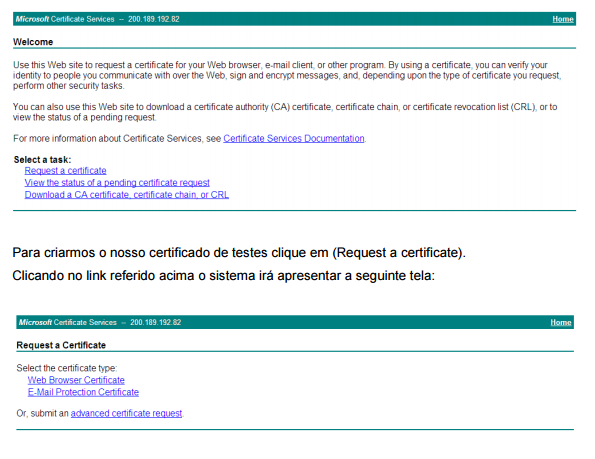 Para criarmos o nosso certificado de testes clique em (Request a certificate). Clicando no link referido acima o sistema irá apresentar a seguinte tela: