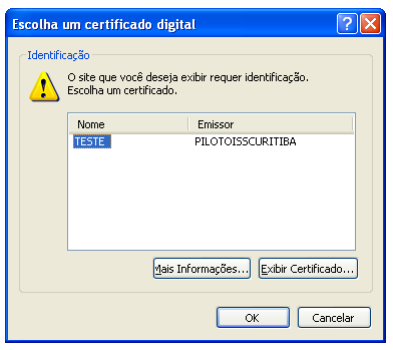 Na caixa de diálogo acima irão aparecer todos os certificados digitais válidos para nossa entidade certificadora (para ambiente piloto). Selecione o certificado digital desejado e clique em OK. Após selecionar o certificado digital entre no ISS Curitiba utilizando o usuário e senha de acesso ao mesmo.