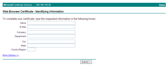 Para que possamos criar um certificado válido (em ambiente piloto) é necessário clicar no link (More Options >>), após selecionado será apresentada a seguinte tela: