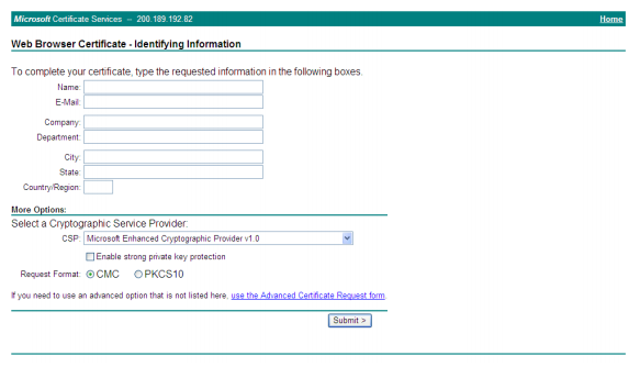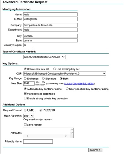 Após o carregamento da página mostrada acima deveremos clicar no link (use the Advanced Certificate Request form), pois necessitamos marcar uma opção para tornar a chave pública exportável. Após clicar no link referido acima será apresentada a seguinte tela: