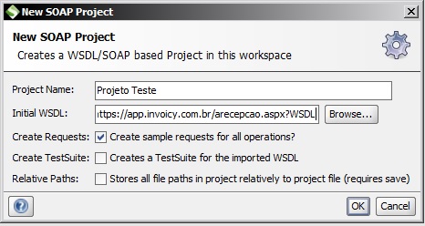 Note que no campo “Project Name” inserimos o valor “Projeto Teste”, e no campo “Initial WSDL” informamos o endereço do Web Service que vamos trabalhar.