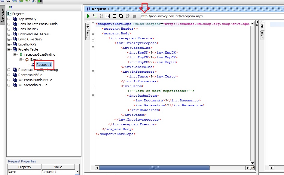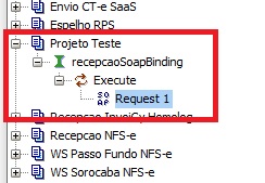 5. Será criado na árvore de projetos um novo item, denominado “Projeto Teste”, contendo a estrutura “RecepcaoSoapBinding” > “Execute” > “Request 1”. Dê duplo clique sobre o item “Request 1”.