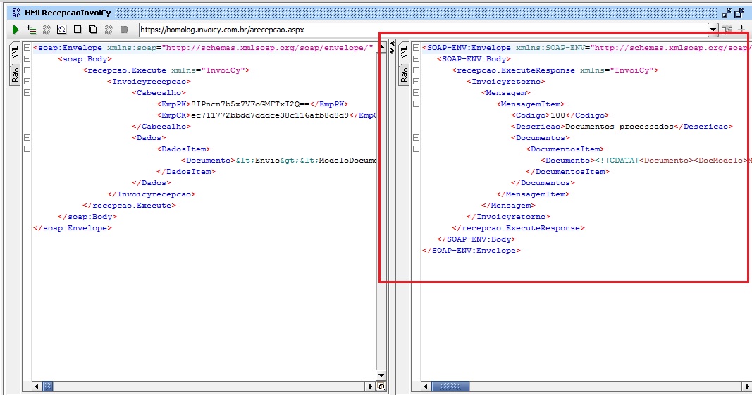 6. Será aberto no quadro ao lado, toda a estrutura Soap do Web Service de Recepção do InvoiCy. Veja: