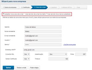 Para receber e-mails de alertas e notificações do InvoiCy a empresa deve realizar o cadastro de uma caixa de e-mail, que o InvoiCy irá utilizar para enviar e-mails do emissor aos seus clientes.