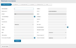 Este Wizard tem o objetivo de auxiliar no cadastro das empresas, que é dividido em 6 etapas. A primeira etapa corresponde aos dados da empresa emissora, onde todos os campos obrigatórios que apresentam um asterisco devem ser preenchidos para prosseguir com o cadastro.