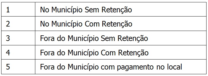 Caso o usuário informar 1 ou 2, o sistema entenderá que o serviço foi prestado no município (valor D no layout da prefeitura). Caso informar 3, 4 ou 5, o serviço foi realizado fora do município (valor F no layout da prefeitura).
