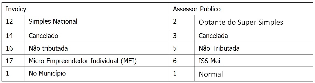 - Os valores aceitos no campo de natureza da operação do Invoicy referentes ao campo Situação do padrão Assessor Publico são listados abaixo. O usuário deverá preencher os valores conforme a coluna do InvoiCy e este valor será convertido para o valor correspondente do padrão: