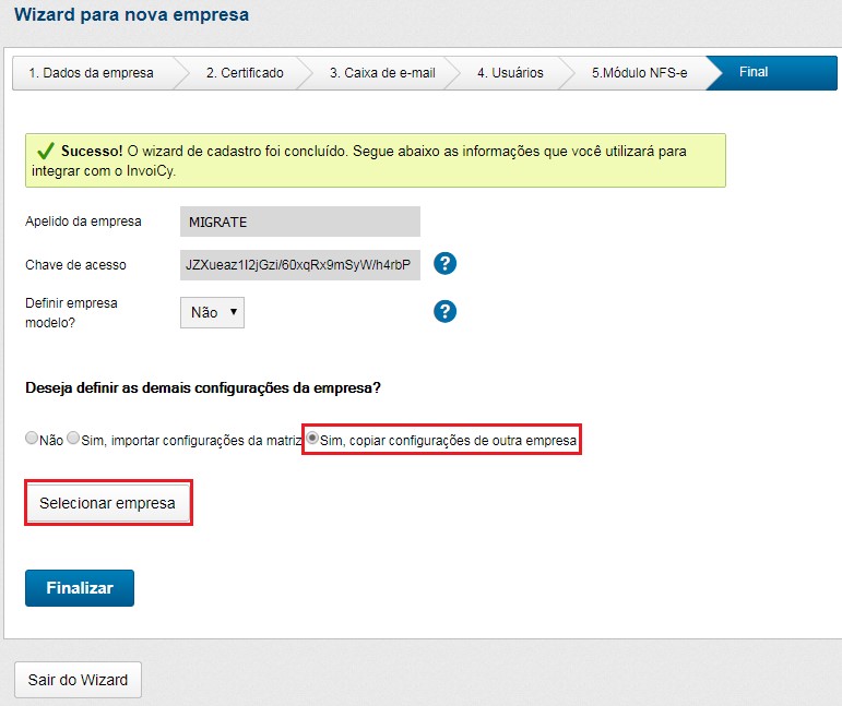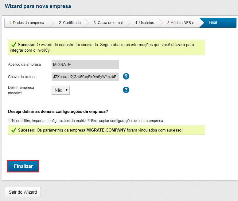 Ao término do Wizard é apresentado um resumo com as informações da empresa, como o apelido da empresa e a chave de acesso que deverá ser utilizada no ERP, AC ou DLL para validar a comunicação.