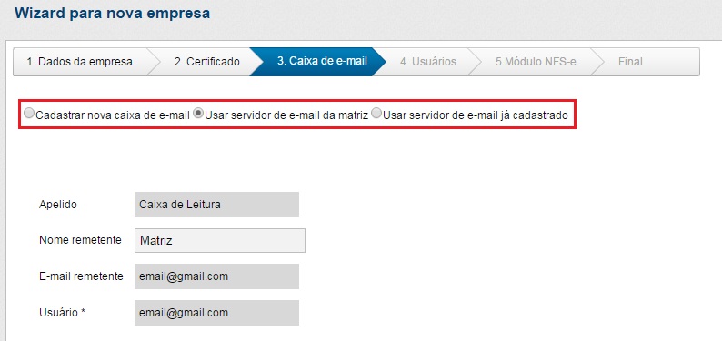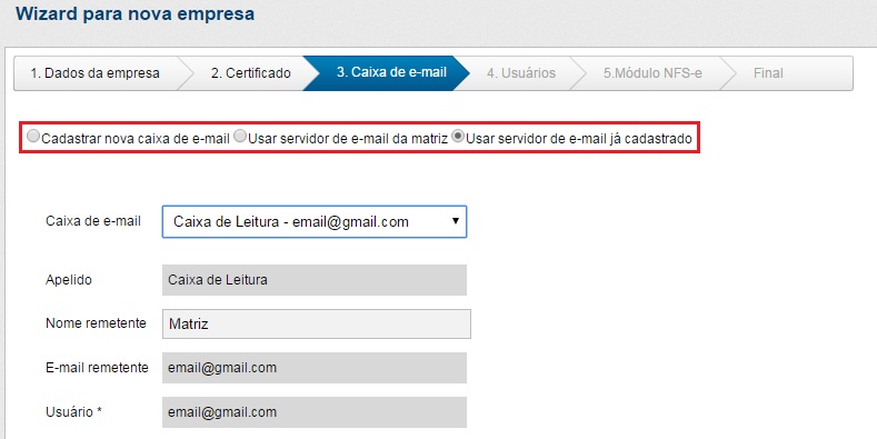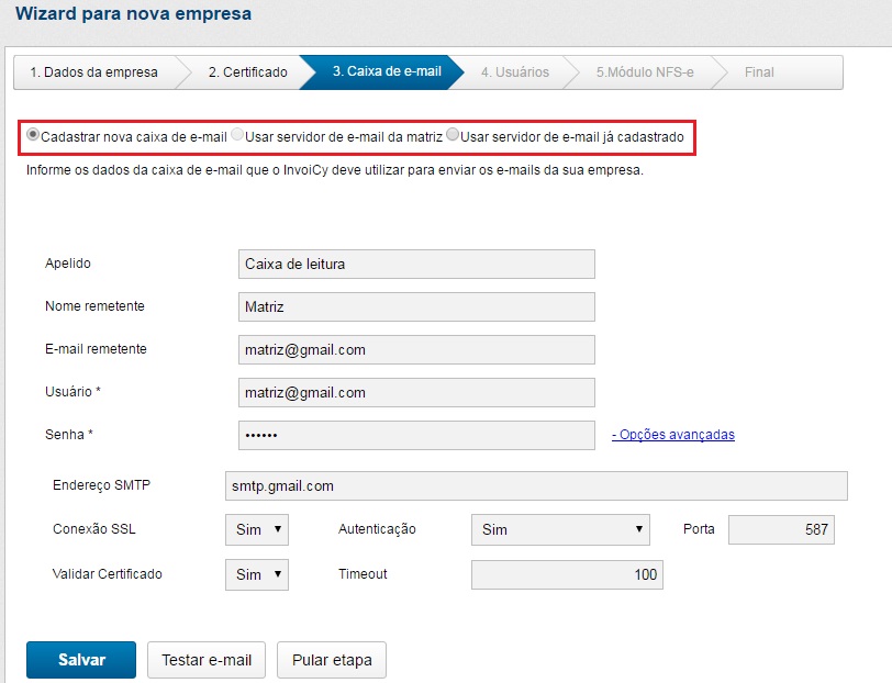 Ao cadastrar uma caixa de e-mail existem 3 opções: