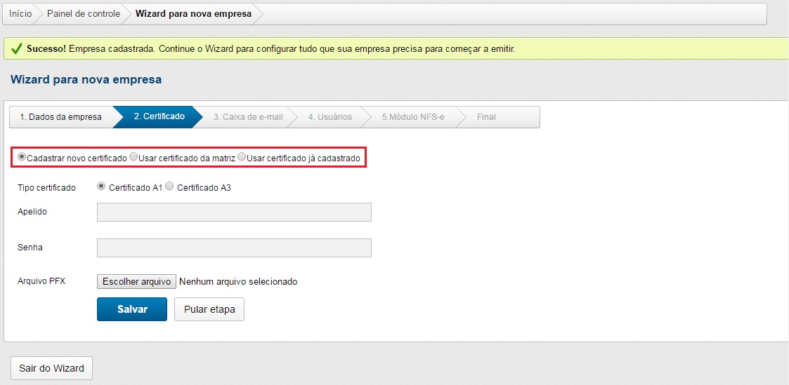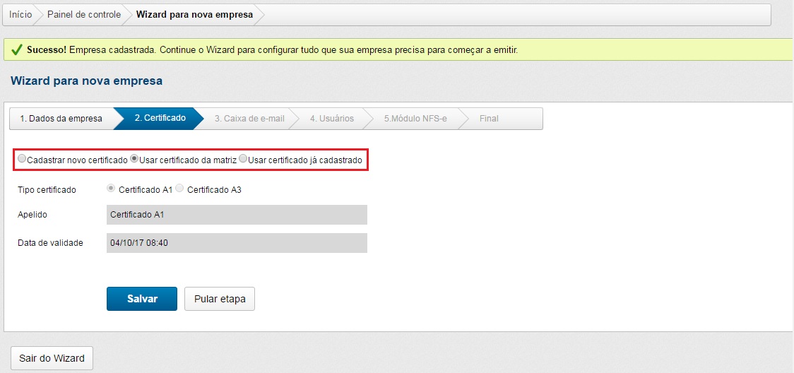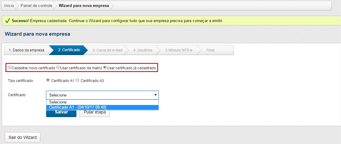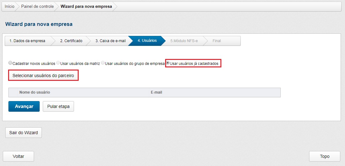 Esta e todas as demais etapas do Wizard são possíveis de serem puladas, mas isto não elimina o cadastro da empresa, somente o deixará incompleto.