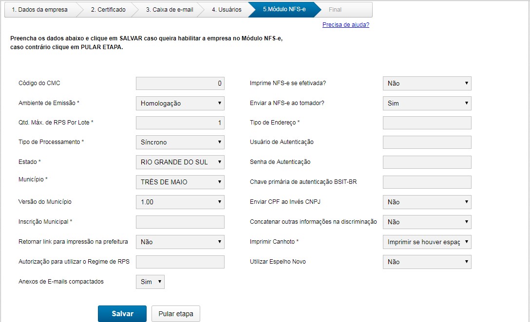 Nesta etapa encontram-se as configurações que são necessárias para o envio de NFS-e. Somente será apresentada essa etapa caso você parceiro possuir licença para o módulo NFS-e, caso contrário será direcionado para a etapa final do Wizard. Porém se a etapa Módulo NFS-e for habilitada devido ao parceiro ter alguma empresa NFS-e, mas sua empresa atual não integrar com este módulo não é necessário o preenchimento dos campos, podendo pular a etapa clicando no botão “Pular etapa”.