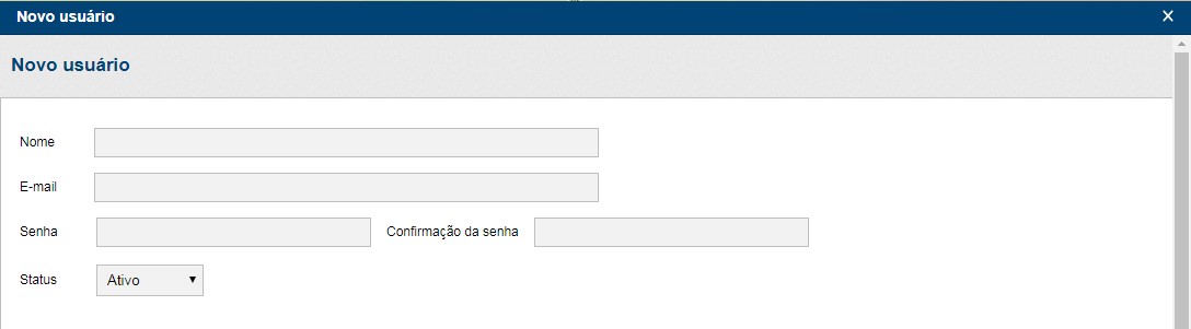 – Cadastrar novos usuários: na tela de cadastro do novo usuário, deve-se preencher os campos da parte superior informando o Nome, E-mail, Senha e Status do usuário cadastrado.