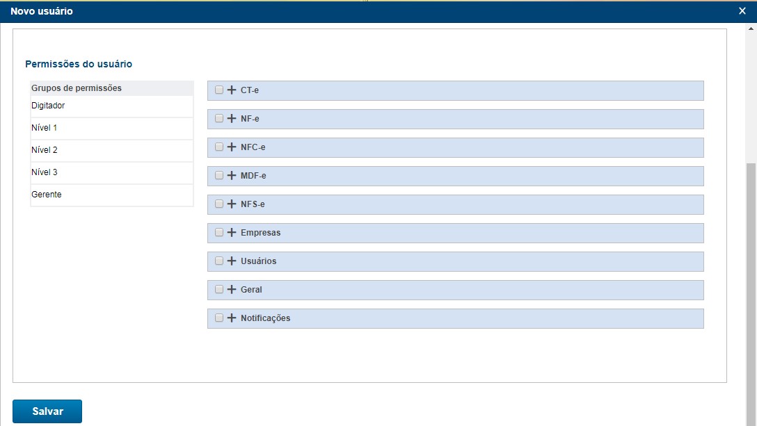 Após deve-se definir as permissões do usuário, ou seja, as ações que ele poderá executar no sistema. Para isso, é possível vincular o usuário a um grupo de permissões, ou configurar separadamente os seus acessos.