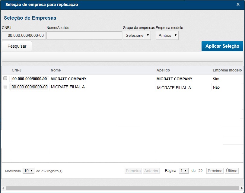 Porém, poderá ser selecionada apenas uma empresa para que seja utilizada como replicação dos dados, se mais empresas foram selecionadas, será utilizada a primeira empresa da etapa “Seleção de empresa para a replicação”.