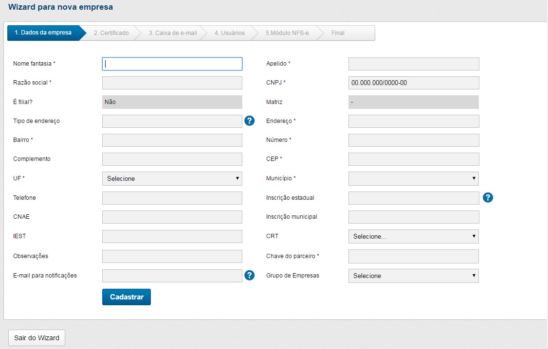 Este Wizard tem o objetivo de auxiliar no cadastro das empresas, que é dividido em 6 etapas. A primeira etapa corresponde aos dados da empresa emissora, onde todos os campos obrigatórios que apresentam um asterisco devem ser preenchidos para prosseguir com o cadastro.