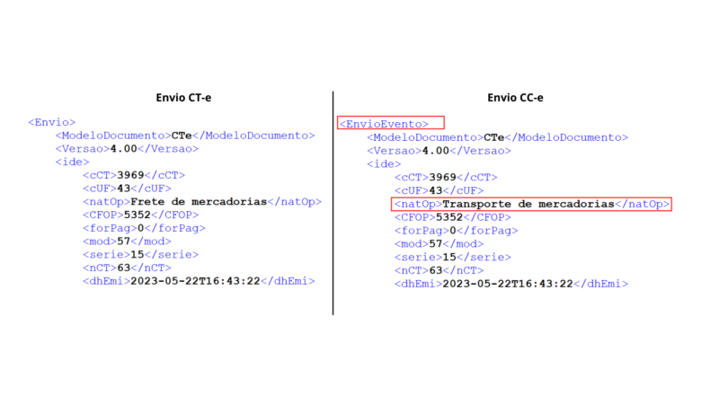 Em nosso exemplo, mostramos como corrigir o valor do campo <natOp>, com o layout de CT-e à esquerda e o de CC-e à direita, destacando a alteração das tags.