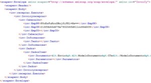 O XML do documento deve ser convertido para texto, e inserido entre as TAGS <inv:Documento> </inv:Documento> do SOAP de envio. Veja abaixo um exemplo: