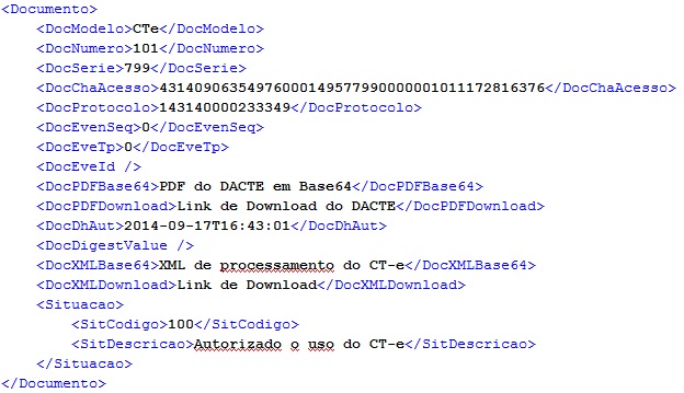 Todo o conteúdo acima estará inserido em uma tag “CDATA” e retornará dentro da TAG <Documento> do SOAP de retorno.