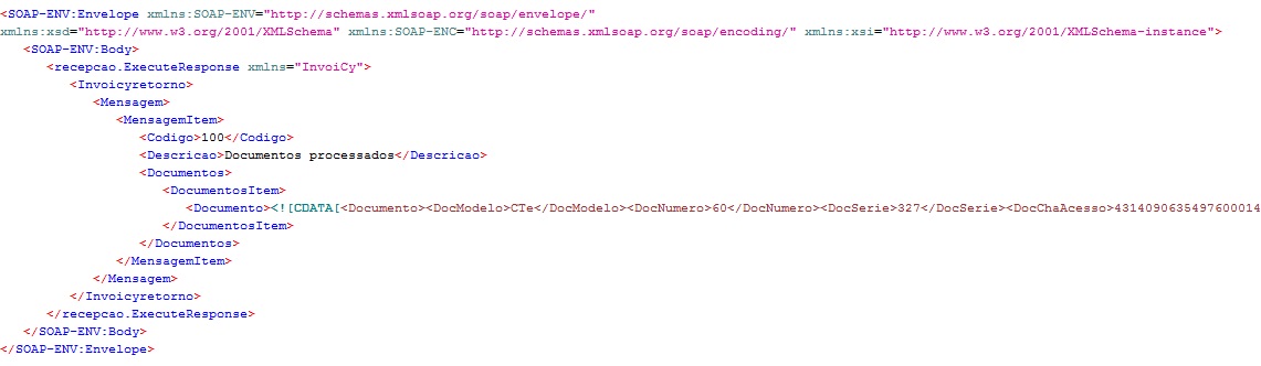 Após o envio do CT-e, precisamos realizar a leitura do retorno do processamento do documento. O retorno recebido segue a seguinte estrutura SOAP: