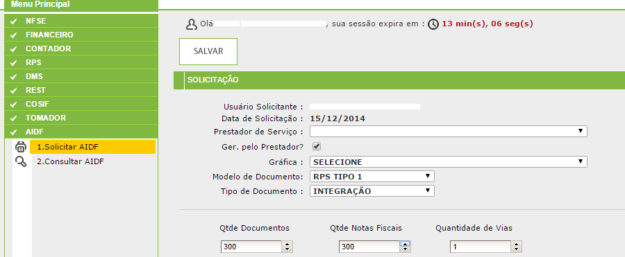 Para permitir o envio de NFS-e via Webservice, é necessário solicitar a liberação via sistema, no Menu Principal -> AIDF -> 1.Solicitar AIDF, como pode ser visualizado na imagem abaixo.
