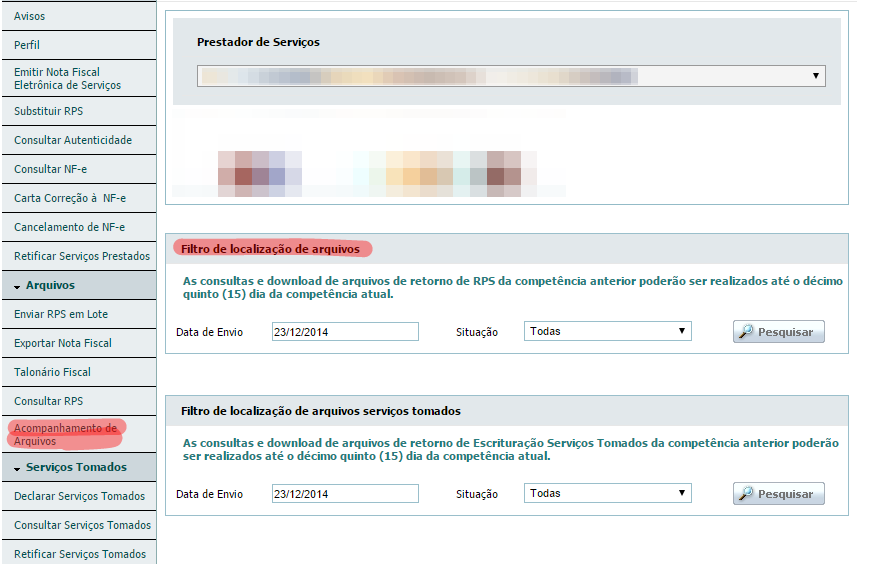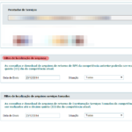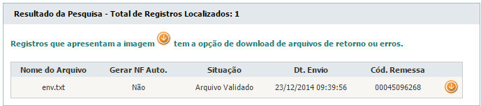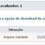 É preciso filtrar pela data de envio do arquivo, no grupo “Filtro de localização de arquivos”. Após filtrar, o sistema irá apresentar os arquivos carregados no dia. A direita, existe um botão que permite fazer o download do arquivo de retorno, que deve ser convertido e enviado ao InvoiCy, para atualização do status do RPS.