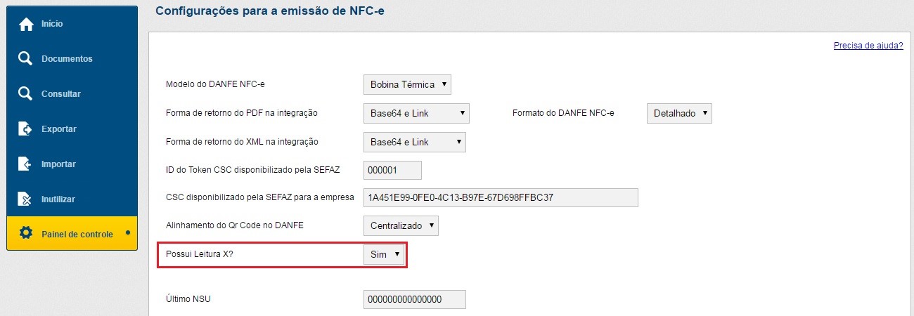 Para fazer uso dessa funcionalidade, a empresa precisa habilitar a configuração de geração da Leitura X, através do Painel de controle – Configurações para emissão do Módulo NFC-e, campo ‘Possui Leitura X?’, como está destacado na imagem a seguir.