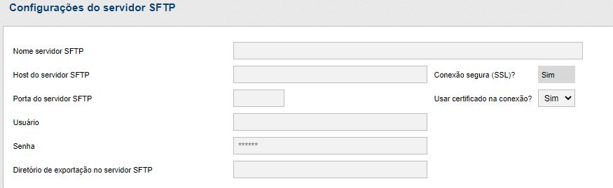 Na tela de “Exportação”, representada na imagem abaixo, é possível configurar os dados do Servidor SFTP, como Host, Porta do servidor, Usuário e Senha, e ainda definir o diretório para exportação dos arquivos no SFTP.