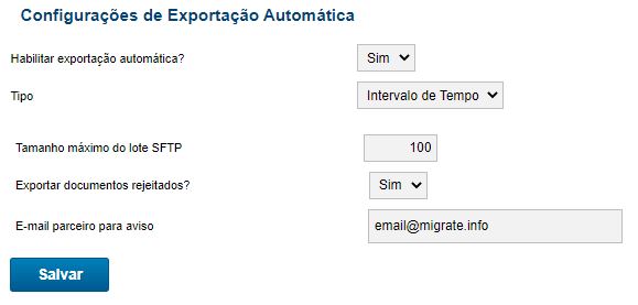 Após configurar os dados do Servidor SFTP o usuário pode definir se a empresa irá exportar os arquivos de forma automática ou não, definindo o tipo de exportação, por período ou intervalo de tempo.