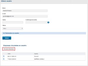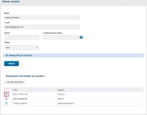 Na tela de edição do usuário é possível visualizar todas as empresas que este usuário está vinculado, e ainda fazer o vínculo de novas empresas, através do botão ‘Vincular empresas’, como destaca a imagem abaixo.