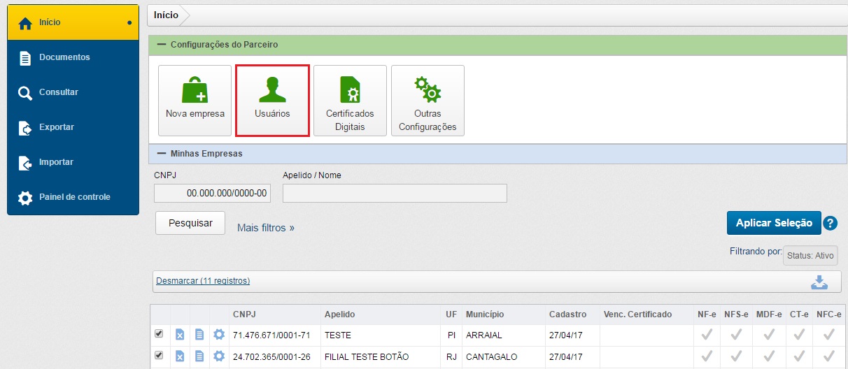 Ao fazer login com o seu usuário na Plataforma InvoiCy, acessar a tela inicial e no grupo ‘Configurações do Parceiro’ clicar na opção ‘Usuários’, como demonstra a imagem a seguir.