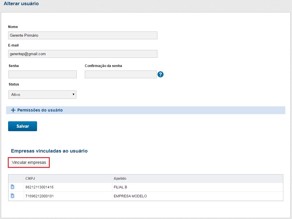 Na tela de edição do usuário é possível visualizar todas as empresas que este usuário está vinculado, e ainda fazer o vínculo de novas empresas, através do botão ‘Vincular empresas’, como destaca a imagem abaixo.