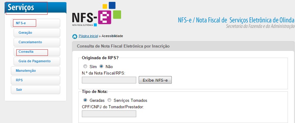 Para realizar a consulta da NFS-e deve acessar o sistema da prefeitura com as credenciais fornecidas pela mesma, após acessar “Serviços -> NFS-e -> Consulta”.