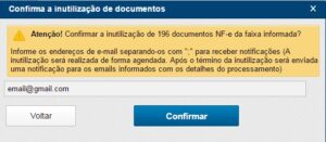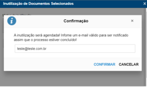 Quando a faixa informada ultrapassar mais de 101 documentos a inutilização será agendada, então juntamente com a tela de confirmação o usuário deverá informar um endereço de e-mail para receber uma notificação com os detalhes do processo. Esse campo já virá preenchido com o e-mail do usuário logado na aplicação, mas podem ser informados vários endereços de e-mail, separando os mesmos com um “;”.