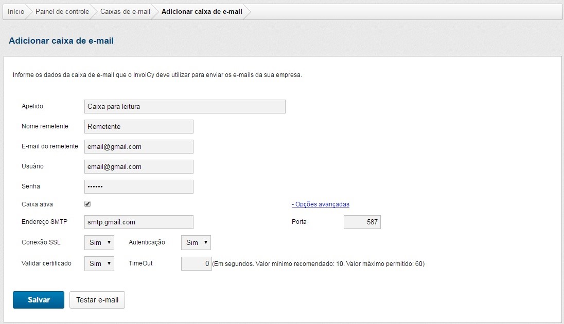 Na sequência deve-se informar os dados da caixa de saída que o InvoiCy irá utilizar para enviar os e-mails da empresa, como apelido da caixa, nome e e-mail do Remetente, usuário e senha, e marcar a caixa como ativa. Nas opções avançadas, deve-se configurar o endereço SMTP, porta, se possui conexão SSL e autenticação, se deve validar o certificado digital e o tempo de timeout. Em seguida clicar no botão Salvar, conforme  a imagem a seguir.
