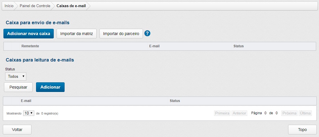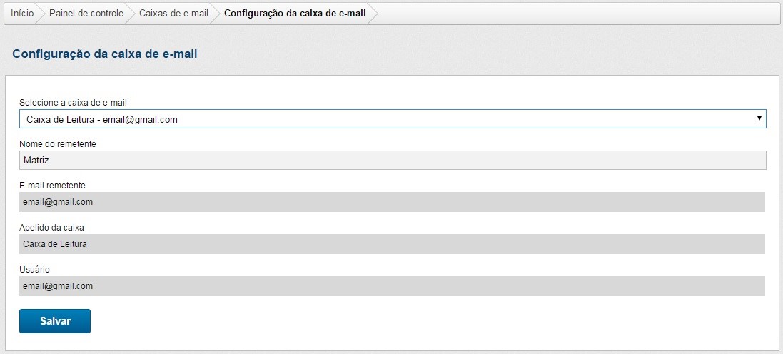 Ao cadastrar uma caixa de e-mail por esta tela, automaticamente será realizado o cadastro da mesma na tela de servidores de e-mails do parceiro, vinculando com a respectiva empresa.