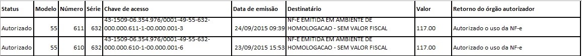 – Exportar lista Microsoft Excel: o InvoiCy irá efetuar a exportação para um arquivo Excel de todos os documentos da grid que estiverem marcados, apresentando as principais informações de cada documento, como: Status, Modelo, Número, Série, Chave de acesso, Data de emissão, Destinatário, Valor e Retorno do órgão autorizador, como demonstra a imagem. Caso não tenha documentos marcados nenhum arquivo será gerado, e uma mensagem informando o usuário aparecerá em tela.