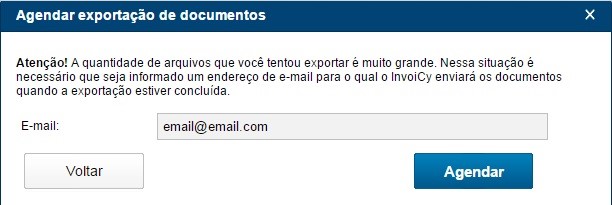 Após informar um endereço de e-mail e clicar no botão Agendar será apresentada uma mensagem em tela, informando se o processo foi executado com sucesso ou não. Ao final da exportação será enviado um e-mail para o endereço informado, contendo os arquivos exportados.