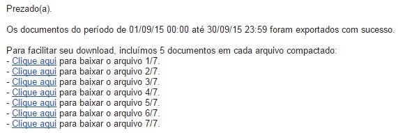 Ao exportar uma quantidade maior do que o limite configurado, os arquivos serão divididos em vários arquivos .zip, e no e-mail será enviado os links para baixar os arquivos exportados. A imagem abaixo representa a estrutura do e-mail enviado.