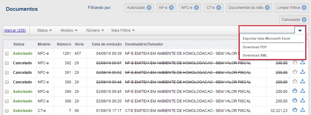 6 de novembro de 2015Buscando facilitar a usabilidade dos usuários do InvoiCy, disponibilizamos uma opção para exportar os documentos para uma lista no Excel, e ainda a possibilidade de efetuar o download de arquivos XML e PDF através da tela inicial da aplicação. Para isso, acesse o ícone posicionado na parte superior direita da grid na tela inicial da aplicação, como demonstra a imagem a seguir.