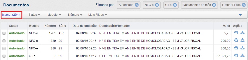 Para facilitar o processo de marcar e desmarcar os documentos selecionados, pode-se fazer uso da opção localizada na parte superior esquerda da tela, como demonstra a imagem a seguir.