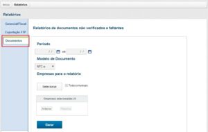 Então na aba “Documentos” é possível informar o período desejado, escolher o modelo de documento que se deseja verificar, selecionar as empresas e clicar no botão “Gerar” para visualizar o relatório. A imagem abaixo representa a tela para geração do relatório. Destacando que deve-se gerar um relatório específico para verificação de cada modelo de documento.