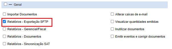 É importante destacar que o acesso à essa tela será permitido apenas para usuários Administradores e Parceiros, ou que possuírem configurada a opção “Relatórios – Exportação SFTP” nas configurações de usuário, como demonstra a imagem abaixo.