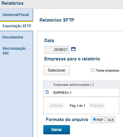 Então na aba “Exportação SFTP” é possível informar a data desejada, selecionar as empresas e clicar no botão “Gerar” para visualizar o relatório. A imagem abaixo representa a tela para geração do relatório.
