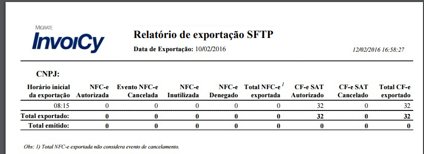 Esse relatório exibe o horário inicial da exportação juntamente com a quantidade de NFC-e e CF-e SAT exportadas na data informada, separando os documentos por status, e exibindo um totalizador de cada quantidade de documento exportado e emitido no dia, como pode-se visualizar na imagem abaixo.