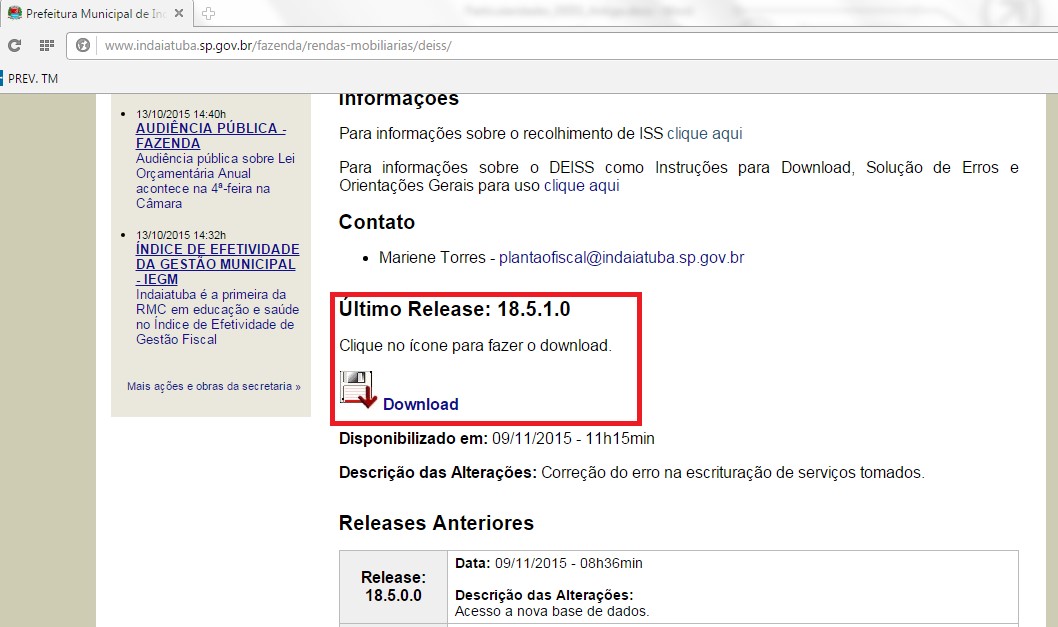 Primeiramente deve-se realizar o download da última versão do software DEISS Indaiatuba no portal da prefeitura, seguindo o caminho “Serviços->DEISS”: