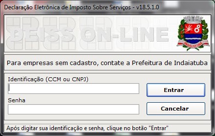 Após o término da instalação, deve-se executar o software e nos campos correspondentes informar as credenciais de acesso cadastradas na prefeitura Inscrição Municipal/CNPJ e senha):