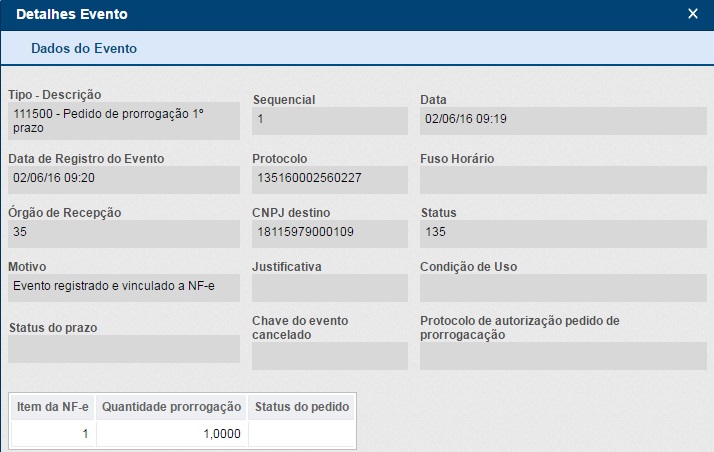 É possível ainda visualizar os detalhes de cada evento, clicando no registro da grid. A imagem abaixo representa os detalhes de um evento de pedido de prorrogação 1º prazo.