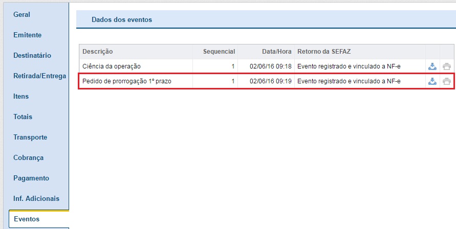 Para os pedidos de prorrogação e cancelamento de pedido de prorrogação, a consulta do registro do Fisco será executada automaticamente, onde o InvoiCy irá consultar na SEFAZ se o pedido foi deferido ou indeferido e sua justificativa, e apresentar a resposta do fisco na tela de eventos. Através dos logs da NF-e também será possível acompanhar o andamento dos processos.