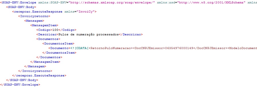 Após efetuar o envio do layout para consulta dos pulos de numeração, deverá retornar o código 100 – Pulos de numeração processados, se o processo foi executado com sucesso. O retorno da consulta segue a seguinte estrutura SOAP.