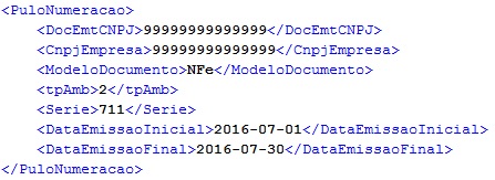 Caso não encontre pulos de numeração para o período informado, irá retornar a mensagem: 100 – Nenhum pulo de numeração encontrado.